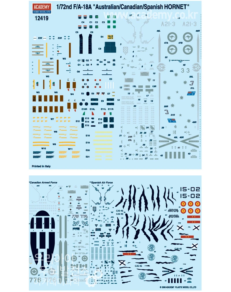 This kit is based on Academy's F/A-18C kit, but includes tail fins to represent an F/A-18A. Decals by Cartograf include an Australian, Canadian, and Spanish example.